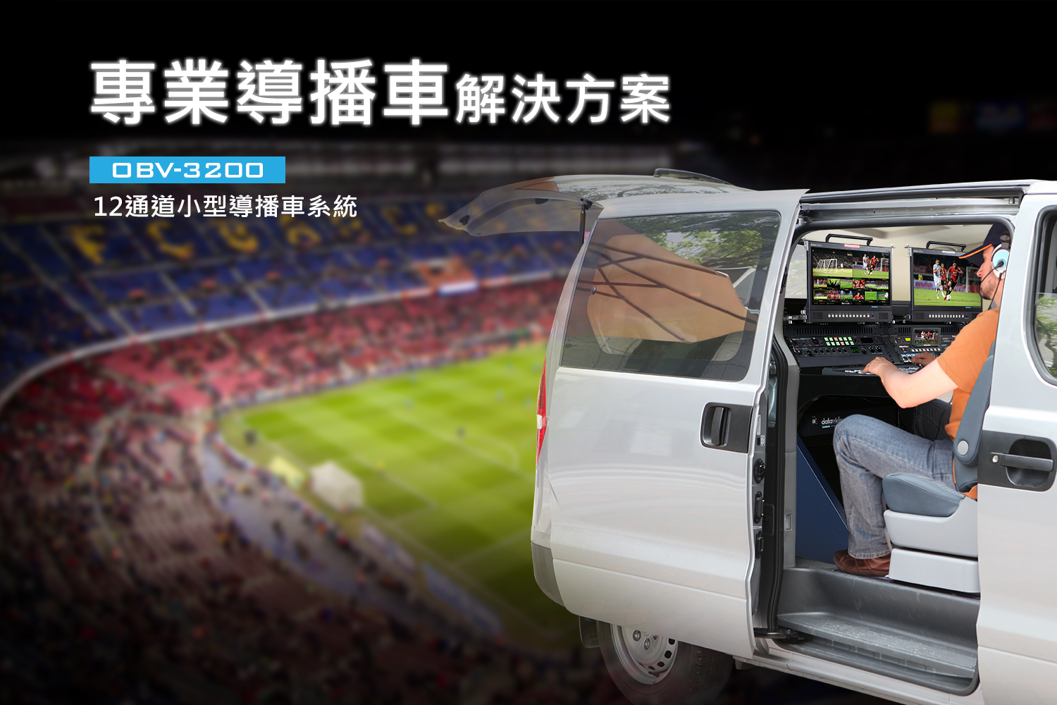 Datavideo特別提供劃時代創新型導播車OBV-3200 小型導播車移動製播解決方案!該製作系統的優勢在於機動性強、製作人力精簡並且具備完整現場影片製作功能,包含專業的導播機、監看螢幕、調音、錄影、直播、數位通話等功能,將專業電視台的節目製作功能匯集於車廂內,是一套專為衝鋒陷陣的媒體工作者所打造的行動方案。OBV-3200 小型導播車解決方案具備主要以下機能: